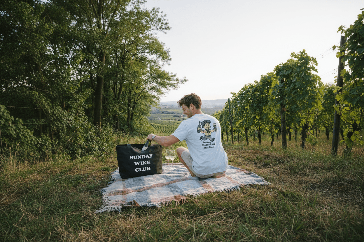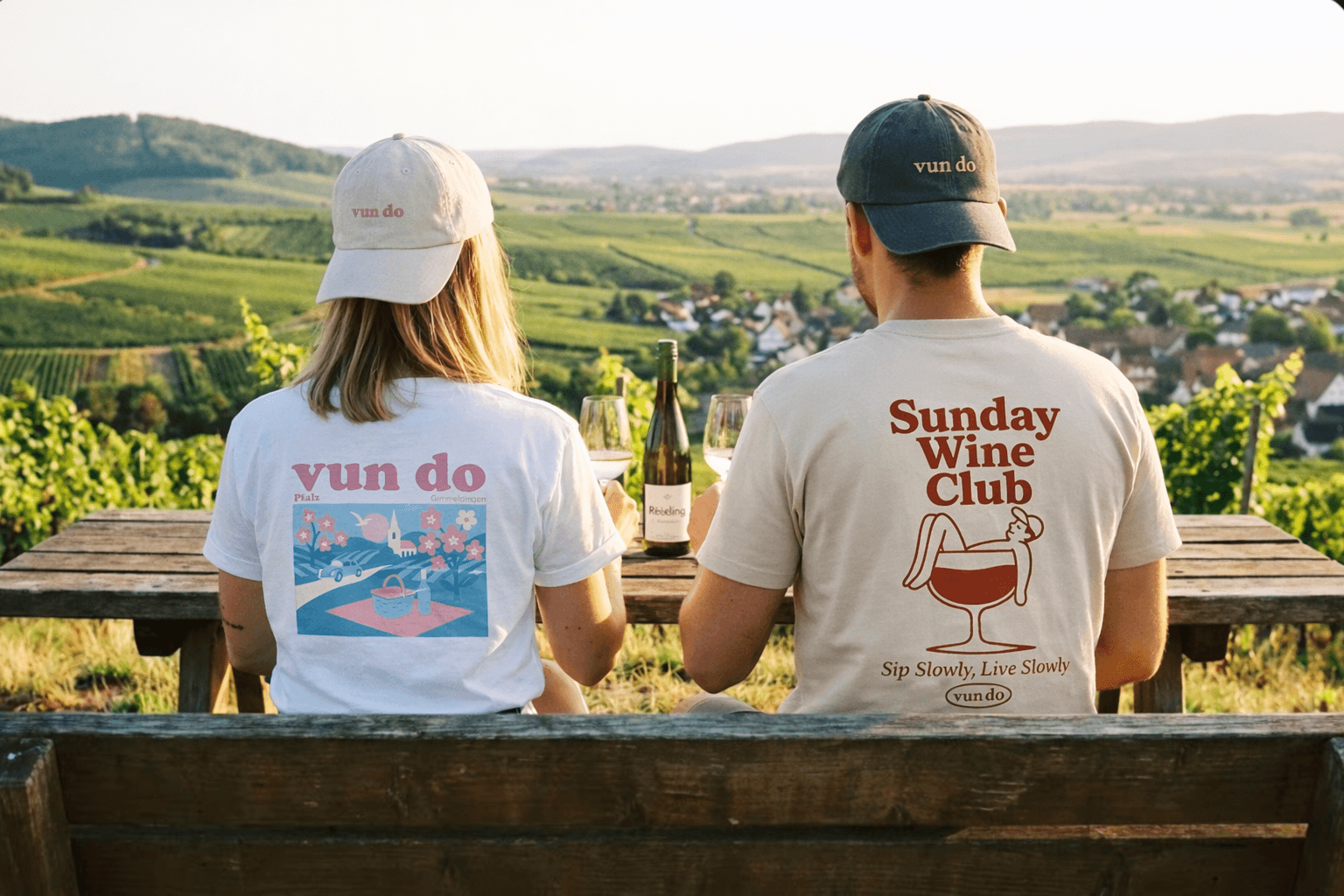 Authentische Designs, inspiriert von Weinbergen und Geselligkeit. Gefertigt aus 100 % Baumwolle für dein bestes Tragegefühl.